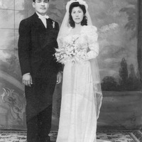 A wedding photograph of Jesse Reyes Ybarra and Velia G. Ybarra. They were married on July 3, 1942. Jesse was a PFC in the US Army Medic Corps during World War Two (from 1942-1945) and lived in San Antonio, Texas, as well as living in Riverside. Jesse died in 2007 and Velia died in 2003; both are buried at the Riverside National Cemetery.