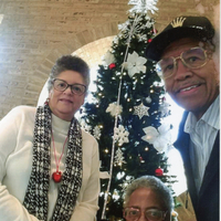 A photo of Denise Brue Clopton, Otis Clopton, and Willie Brue dressed for Christmas with a Christmas tree in the background.